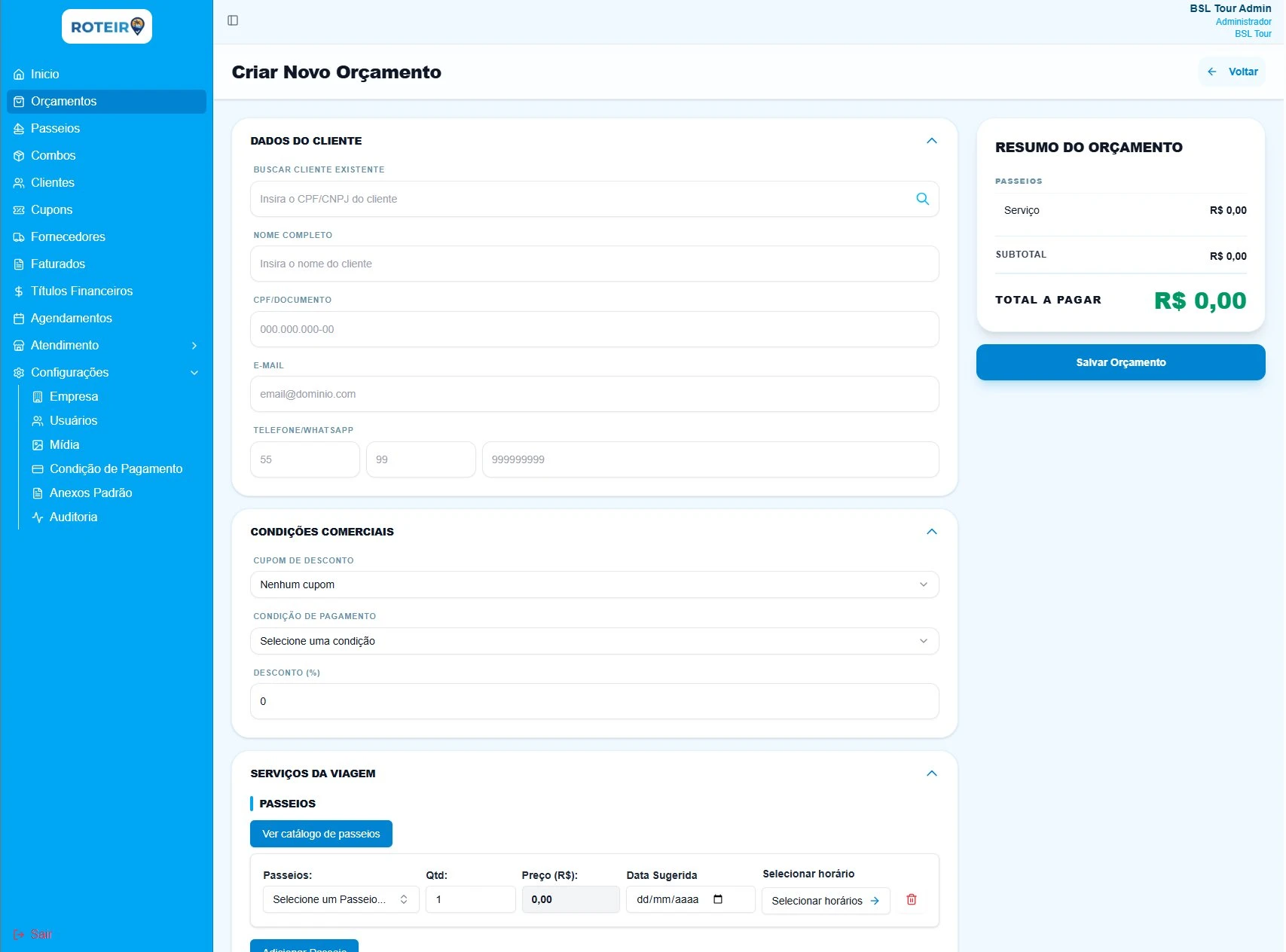 Sistema completo para agências de turismo: do orçamento à confirmação, tudo automatizado para você vender mais.